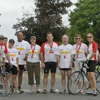 Here’s Team Bauer at the end of a very soggy 50 mile ride for the 2007 BKM/Steelcase MS Bike Tour. We rode in tribute to Bridget’s (second from right) sister Sheila and brother-in-law Dave, who both have MS. It started to pour buckets shortly before the 9am start, but once you’re wet, you’re wet, right? I had a bit of mechanical trouble with my chain ring/derailer, but Doug Tanner from Benidorm Bikes and Boards was there to fix my bike for me around the half-way point. The rain finally ended about mile thirty, so we had a decent ride into the finish. Thanks to all our friends and family for their support. We raised a total of $2,880 for the MS Society of CT. Next year 100 miles, right folks?